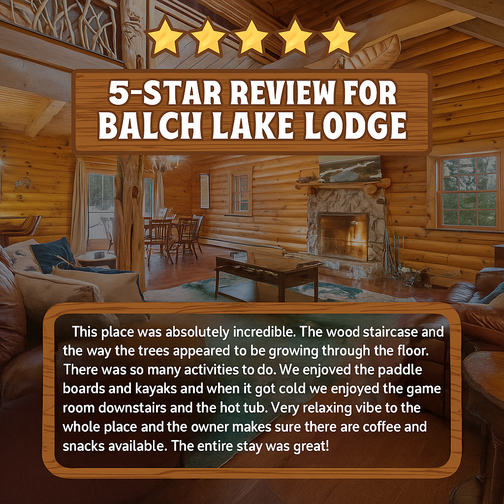 Nestled within vibrant fall foliage, this stunning 4-bedroom, 2.5-bath log home awaits you in a private cove on serene Balch Lake. Embrace crisp mornings, golden afternoons, and cozy nights by the fire in this secluded autumn paradise.
